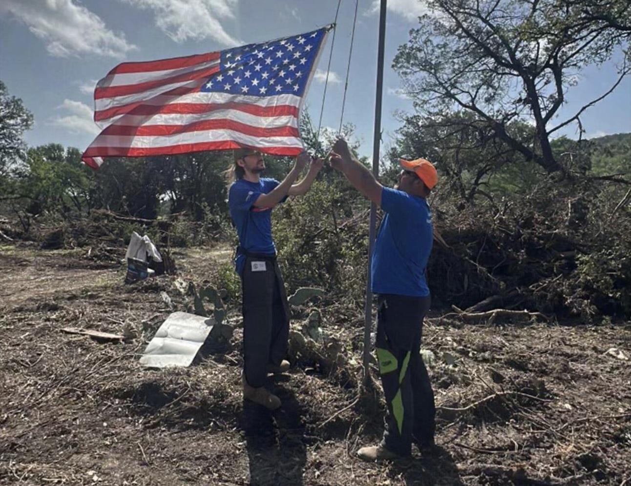 In the aftermath of the flooding in Texas, Larry Agee (right) and his son, Adam, raise a U.S. flag along the Guadalupe River.