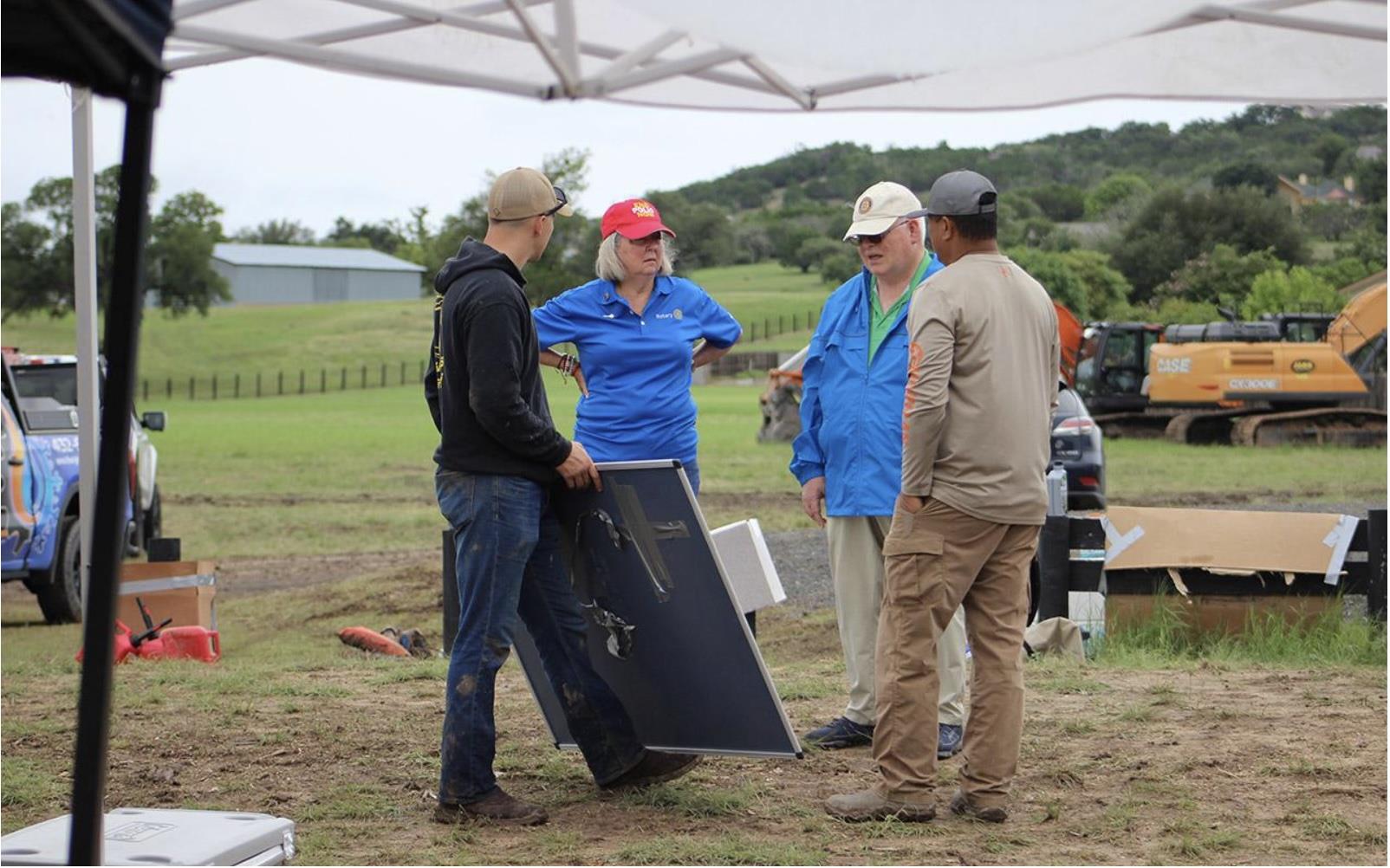 Texas Rotary member Woody Lockhart, middle, past RI Director Suzi Howe, and others discuss flood relief efforts.